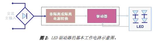 LED 的排列方式及LED 光源的規範決定著基本的驅動器要求。LED 驅動器的主要功能就是在一定的工作條件範圍下限製流過LED 的電流, 而無論輸入及輸出電壓如何變化。LED驅動器基本的工作電路示意圖如圖2 所示,其中所謂的“隔離”表示交流線路電壓與LED(即輸入與輸出)之間沒有物理上的電氣連接,最常用的是采用變壓器來電氣隔離,而“非隔離”則沒有采用高頻變壓器來電氣隔離。