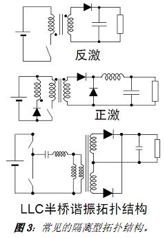 電路中通常加入了變壓器的隔離型AC-DC 電源轉換包含反激、正激及半橋等拓撲結構,參見圖3,其中反激拓撲結構是功率小於30 W 的中低功率應用的標準選擇,而半橋結構則最適合於提供更高能效/功率密度。就隔離結構中的變壓器而言,其尺寸的大小與開關頻率有關,且多數隔離型 LED 驅動器基本上采用“電子”變壓器。