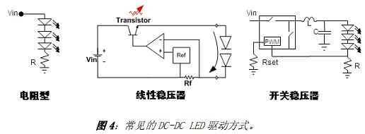 采用 DC-DC 電源的LED 照明應用中,可以采用的LED 驅動方式有電阻型、線性穩壓器及開關穩壓器等,基本的應用示意圖參見圖 4。電阻型驅動方式中,調整與LED 串聯的電流檢測電阻即可控製LED 的正向電流,這種驅動方式易於設計、成本低,且沒有電磁兼容(EMC)問題,劣勢是依賴於電壓、需要篩選(binning) LED,且能效較低。