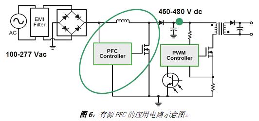 有源 PFC(見圖6)通常是作為一個專門的電源轉換段增加到電路中來改變輸入電流波形。有源PFC 通常提供升壓,交流100 至277 Vac的寬輸入範圍下,PFC 輸出電壓範圍達直流450 至480 Vdc。如果恰當地設計PFC 段,可以提供91%到95%的高能效。但增加了有源PFC,仍然需要專門的DC-DC 轉換來提供電流穩流。