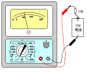 測量直流電流:--先估計一下被測電流的大小,然後將轉換開關撥至合適的mA量程,再把萬用表串接在電路中,如圖所示。同時觀察標有直流符號“DC”的刻度線,如電流量程選在3mA檔,這時,應把表麵刻度線上300的數字,去掉兩個“0”,看成3,又依次把200、100看成是2、1,這樣就可以讀出被測電流數值。例如用直流3mA檔測量直流電流,指針在100,則電流為1mA。