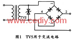 圖1所示是一個雙向TVS在交流電路中的應用電路。應用TVS可以有效地抑製電網帶來的過載脈衝,從而起到保護整流橋及負載中所有元器件的作用。圖1中的TVS箝位電壓應不大於電路的最大允許電壓。