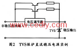圖2是一個直流穩壓電源,在其穩壓輸出端加上TVS,可以保護使用該電源的儀器設備,同時還可以吸收電路中晶體管的集電極到發射極間的峰值電壓,從而保護晶體管。建議在每個穩壓源的輸出端增加一個TVS管,這樣可以大幅度地提高整機的可靠性。