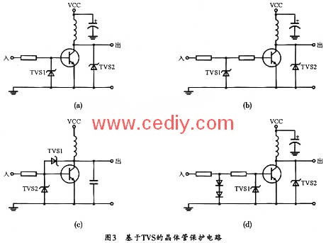 各種瞬變電壓能使晶體管的EB結或CE結擊穿而損壞,特別是晶體管集電極有感性(線圈、變壓器、電動機)負載時,通常會產生高壓反電勢,因而可能使晶體管損壞。在實際應用中,建議采用TVS作為保護器件。圖3所示為TVS保護晶體管的四種電路實例。