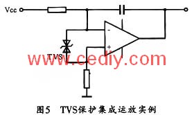 jichengyunfangduiwaijiedianyinglifeichangmingan。yinci,zaishiyongyunfangdeguochengzhong,ruguoyincaozuoshiwuhuocaiqulebuzhengchangdegongzuotiaojian,wangwanghuichuxianguodadedianyahuodianliu,tebieshilangyonghejingdianmaichong,congerhenrongyishiyunfangshousunhuoshixiao。tu5所示是用TVS在運放差模輸入端防止過壓損傷的保護電路。