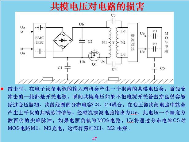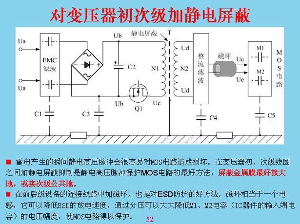 對於一些比較貴重的儀器、設(she)備(bei),在(zai)開(kai)關(guan)電(dian)容(rong)電(dian)壓(ya)器(qi)這(zhe)裏(li)最(zui)好(hao)做(zuo)靜(jing)電(dian)比(bi)例(li),在(zai)初(chu)次(ci)級(ji)線(xian)圈(quan)中(zhong)間(jian)做(zuo)一(yi)個(ge)鋁(lv)箔(bo)片(pian)都(dou)可(ke)以(yi),包(bao)一(yi)層(ceng),這(zhe)層(ceng)不(bu)能(neng)短(duan)路(lu),短(duan)路(lu)的(de)話(hua)變(bian)壓(ya)器(qi)就(jiu)會(hui)燒(shao)掉(diao),包(bao)在(zai)外(wai)麵(mian)可(ke)以(yi)短(duan)路(lu),包(bao)在(zai)裏(li)麵(mian)不(bu)能(neng)短(duan)路(lu),包(bao)在(zai)外(wai)麵(mian)吸(xi)收(shou)漏(lou)電(dian)電(dian)感(gan),包(bao)在(zai)裏(li)麵(mian)的(de)主(zhu)回(hui)路(lu)裏(li)麵(mian)會(hui)短(duan)路(lu),然(ran)後(hou)把(ba)它(ta)進(jin)行(xing)接(jie)地(di),這(zhe)相(xiang)當(dang)於(yu)可(ke)以(yi)隔(ge)離(li)掉(diao)。這(zhe)個(ge)有(you)一(yi)個(ge)教(jiao)訓(xun),前(qian)段(duan)時(shi)間(jian)康(kang)佳(jia)台(tai)灣(wan)裝(zhuang)LCD屏測試,打了一個隔離變壓器,後麵就是接測試儀表,每個月都有一台、兩(liang)台(tai)測(ce)試(shi)儀(yi)表(biao)損(sun)壞(huai),查(zha)不(bu)出(chu)原(yuan)因(yin),最(zui)後(hou)讓(rang)他(ta)們(men)把(ba)隔(ge)離(li)變(bian)壓(ya)器(qi)的(de)中(zhong)間(jian)屏(ping)蔽(bi)才(cai)好(hao)。屏(ping)蔽(bi)以(yi)後(hou),進(jin)一(yi)步(bu)有(you)機(ji)會(hui)的(de)話(hua),在(zai)接(jie)頭(tou)有(you)連(lian)接(jie)的(de)地(di)方(fang)加(jia)一(yi)個(ge)磁(ci)環(huan),讓(rang)共(gong)模(mo)電(dian)壓(ya)將(jiang)磁(ci)環(huan)速(su)度(du)放(fang)慢(man),緩(huan)衝(chong)一(yi)下(xia),讓(rang)瞬(shun)間(jian)能(neng)量(liang)降(jiang)低(di),瞬(shun)間(jian)能(neng)量(liang)緩(huan)慢(man)一(yi)點(dian),慢(man)慢(man)的(de)過(guo),損(sun)傷(shang)就(jiu)會(hui)少(shao)很(hen)多(duo)。所(suo)有(you)電(dian)路(lu)都(dou)可(ke)以(yi)把(ba)它(ta)看(kan)成(cheng)一(yi)個(ge)分(fen)布(bu)電(dian)流(liu),隻(zhi)要(yao)某(mou)地(di)方(fang)電(dian)壓(ya)電(dian)位(wei)在(zai)改(gai)變(bian),對(dui)後(hou)麵(mian)都(dou)會(hui)產(chan)生(sheng)充(chong)放(fang)電(dian),從(cong)這(zhe)上(shang)麵(mian)理(li)解(jie)就(jiu)知(zhi)道(dao)了(le),如(ru)果(guo)哪(na)個(ge)地(di)方(fang)構(gou)成(cheng)回(hui)路(lu),如(ru)果(guo)有(you)一(yi)個(ge)高(gao)電(dian)壓(ya)進(jin)來(lai)一(yi)直(zhi)傳(chuan)導(dao)到(dao)後(hou)麵(mian),最(zui)後(hou)充(chong)電(dian),充(chong)電(dian)可(ke)以(yi)理(li)解(jie)成(cheng)分(fen)布(bu)電(dian)容(rong),如(ru)果(guo)沒(mei)有(you)這(zhe)個(ge)也(ye)有(you)一(yi)個(ge)分(fen)布(bu)電(dian)容(rong)在(zai)裏(li)麵(mian),把(ba)分(fen)布(bu)電(dian)容(rong)放(fang)在(zai)這(zhe)裏(li),就(jiu)比(bi)較(jiao)形(xing)象(xiang)地(di)。就(jiu)像(xiang)以(yi)前(qian)的(de)絕(jue)緣(yuan)長(chang)效(xiao)濾(lv)管(guan)一(yi)樣(yang),手(shou)一(yi)摸(mo)沒(mei)有(you)造(zao)成(cheng)回(hui)路(lu)也(ye)壞(huai)掉(diao)了(le),絕(jue)緣(yuan)的(de)濾(lv)管(guan)很(hen)容(rong)易(yi)壞(huai),一(yi)從(cong)裏(li)麵(mian)拿(na)出(chu)來(lai),手(shou)一(yi)摸(mo)就(jiu)壞(huai)掉(diao),一(yi)個(ge)身(shen)上(shang)麵(mian)帶(dai)正(zheng)電(dian),或(huo)者(zhe)你(ni)作(zuo)為(wei)天(tian)線(xian)有(you)感(gan)應(ying)電(dian)壓(ya),感(gan)應(ying)一(yi)下(xia)來(lai)回(hui)充(chong)放(fang)電(dian)就(jiu)壞(huai)掉(diao)了(le)。