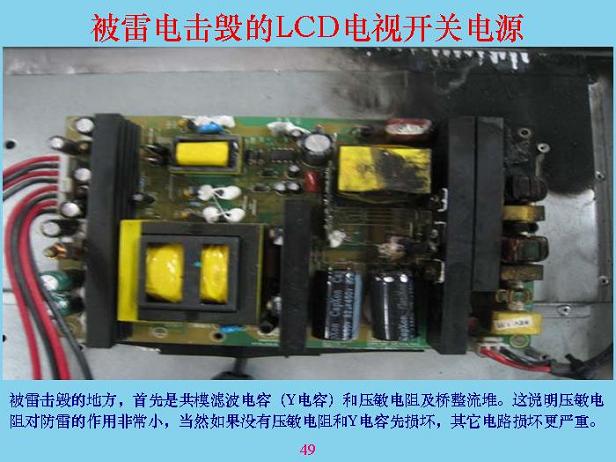 下(xia)麵(mian)我(wo)們(men)講(jiang)一(yi)些(xie)具(ju)體(ti)的(de)。這(zhe)是(shi)一(yi)個(ge)開(kai)關(guan)電(dian)源(yuan),開(kai)關(guan)電(dian)源(yuan)被(bei)雷(lei)劈(pi)的(de)時(shi)候(hou),輸(shu)入(ru)回(hui)路(lu)基(ji)本(ben)上(shang)都(dou)燒(shao)了(le),假(jia)如(ru)沒(mei)燒(shao)是(shi)什(shen)麼(me)樣(yang)的(de)?可(ke)以(yi)看(kan)看(kan),這(zhe)是(shi)橋(qiao)堆(dui),這(zhe)兩(liang)個(ge)是(shi)Ydianrong,zhelimianhaiyouyigeyamindianzu。zheshigongmoxianquan,leipiyihouquanbushaole,shuomingyamindianzumeiyouqidaoshenmebaohuzuoyong,lianggedianrongdoushaole,shuomingdianganxiangdang、相(xiang)當(dang)地(di)高(gao)。為(wei)了(le)防(fang)止(zhi)雷(lei)電(dian),首(shou)先(xian)前(qian)麵(mian)一(yi)定(ding)要(yao)加(jia)一(yi)個(ge)能(neng)量(liang)吸(xi)收(shou),比(bi)較(jiao)大(da)的(de)東(dong)西(xi),成(cheng)本(ben)相(xiang)對(dui)來(lai)說(shuo)比(bi)較(jiao)低(di),像(xiang)試(shi)驗(yan)站(zhan)裏(li)麵(mian)的(de)放(fang)電(dian)裝(zhuang)置(zhi),那(na)個(ge)東(dong)西(xi)沒(mei)有(you)地(di)方(fang)裝(zhuang),也(ye)貴(gui)得(de)很(hen)。在(zai)硬(ying)紙(zhi)板(ban)上(shang)麵(mian)排(pai)幾(ji)個(ge)鋸(ju)齒(chi),中(zhong)間(jian)隔(ge)一(yi)個(ge)頭(tou)就(jiu)行(xing)了(le)。如(ru)果(guo)中(zhong)間(jian)隔(ge)6mm也可以。有一個一級電感,電感可以使瞬間上去很快的電壓降下來,突然加一個1萬伏、10萬wan伏fu,加jia上shang去qu隻zhi有you這zhe兩liang端duan,另ling外wai兩liang端duan建jian立li不bu起qi來lai,所suo以yi剛gang加jia進jin去qu的de時shi候hou對dui雷lei電dian來lai說shuo,大da部bu分fen能neng量liang都dou被bei吸xi收shou掉diao了le。後hou麵mian經jing過guo這zhe個ge以yi後hou,剩sheng餘yu部bu分fen通tong過guo共gong膜mo電dian容rong繼ji續xu吸xi收shou,吸xi收shou完wan以yi後hou還hai有you差cha模mo部bu分fen,產chan生sheng的de差cha模mo部bu分fen通tong過guo電dian容rong把ba差cha模mo吸xi收shou掉diao。共gong模mo電dian容rong和he差cha模mo電dian容rong具ju有you抑yi製zhi傳chuan導dao幹gan擾rao的de作zuo用yong,對dui雷lei電dian也ye有you抑yi製zhi作zuo用yong,所suo以yi很hen多duo人ren也ye在zai問wen,電dian容rong接jie到dao前qian麵mian好hao還hai是shi接jie在zai後hou麵mian好hao?這zhe個ge東dong西xi看kan你ni有you什shen麼me作zuo用yong,如ru果guo隻zhi是shi為wei了le防fangEMI電(dian)磁(ci)幹(gan)擾(rao)的(de)話(hua),接(jie)在(zai)越(yue)前(qian)麵(mian)越(yue)好(hao),接(jie)在(zai)測(ce)試(shi)儀(yi)表(biao)的(de)輸(shu)入(ru)端(duan)最(zui)好(hao),接(jie)到(dao)那(na)裏(li)把(ba)信(xin)號(hao)全(quan)部(bu)短(duan)路(lu)掉(diao)了(le),就(jiu)看(kan)不(bu)到(dao)了(le)。但(dan)是(shi)對(dui)於(yu)雷(lei)電(dian),你(ni)接(jie)到(dao)後(hou)麵(mian)要(yao)好(hao)很(hen)多(duo),所(suo)以(yi)這(zhe)主(zhu)要(yao)是(shi)防(fang)雷(lei)的(de),你(ni)就(jiu)不(bu)要(yao)考(kao)慮(lv)電(dian)磁(ci)幹(gan)擾(rao)和(he)EMC了,盡量把兩個放在後麵。