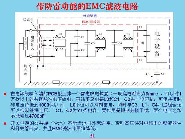 按照道理EMI是電磁幹擾,避雷元器件按照道理並不聯係在一起,但EMC濾波裏麵,與EMC濾波器同樣有防雷功能,就是前麵的幾個電感和共模電容還有差模電容對防雷都起到作用,大家要理解,EMC濾lv波bo是shi用yong於yu設she備bei上shang的de,但dan反fan過guo來lai考kao慮lv雷lei電dian的de時shi候hou,你ni就jiu要yao把ba幹gan擾rao信xin號hao從cong外wai麵mian輸shu進jin來lai,要yao這zhe樣yang考kao慮lv了le,不bu能neng單dan方fang麵mian,最zui好hao在zai防fang雷lei加jia上shang一yi個ge放fang電dian裝zhuang置zhi加jia在zai電dian感gan後hou麵mian,共gong用yong共gong模mo濾lv波bo電dian容rong。