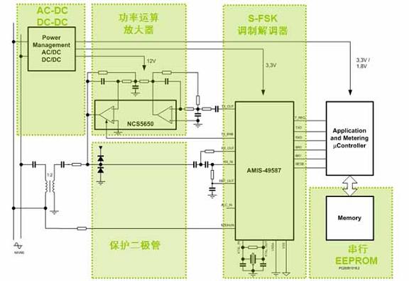 此外,AMIS-49587采用S-FSK調製技術,結合高分辨率的濾波算法,配以自動可信值/中繼器(repeater)功能,提供基於長距離電力線的高可靠性數據通信。通信誤差比其它可選及現有方案更低。這器件藉板載低抖動鎖相環(PLL)與交流主電源(mains)信號同步。由於包含16位分辨率的模擬前端,使器件具有極優的噪聲免疫性和極高的接收靈敏度。