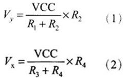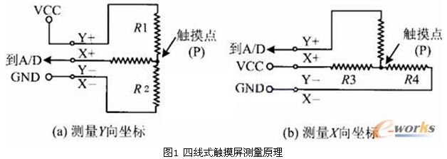 觸摸層的兩個金屬導電層分別用來測量X軸和Y軸方向的坐標。用於X坐標測量的導電層從左右兩端引出兩個電極,記為X+和X-。用於Y坐標測量的導電層從上下兩端引出兩個電極,記為Y+和Y-。這就是四線電阻觸摸屏的引線構成。當在一對電極上施加電壓時,在該導電層上就會形成均勻連接的電壓分布國。若在X方向的電極對上施加一確定的電壓,而Y方向電極對上不加電壓時,在X平行電壓場中,觸點處的電壓值可在在Y+(或Y-)電極上反映出來,通過測量Y+電極對地的電壓大小,便可得知觸點的X坐標值。同理,當在Y電極對上加電壓,而X電極對上不加電壓時,通過測量X+電極的電壓,便可得知觸點的Y坐標。測量原理如圖1所示。