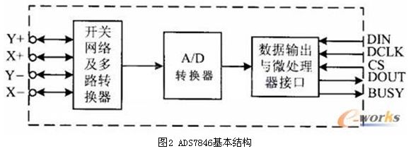 觸摸屏控製器有多種,主要的功能均是在微處理器的控製下向觸摸屏的兩個方向分時施加電壓,並將相應的電壓信號傳送給自身A/D轉換器,在微處理器SPI口提供的同步時鍾作用下將數字信號讀入微處理器。控製器ADS7846基本結構如圖2所示。