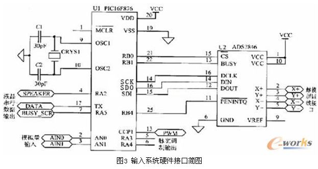 根據ADS7846與微控製器進行數據交換的接口特征,選用PIC16F876的SPI口。SPI口包括三個信號:SDO(串行數據輸出),SDI(串行數據輸入),SCK(串行同步時鍾)。硬件連接關係見圖3。