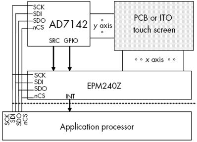 AD7142 CDC可以測量14個傳感器相對於一條SRC走線的電容。增加MAX IIZ CPLD後,可在串行接口的控製下,獲得AD7142 CDC的SRC方波信號,並選擇驅動觸摸屏的某一條垂直x走線,從而支持多條SRC走線。AD7142 CDC可以進行相對於垂直走線軸或者本地的電容測量。MAX IIZ中大量的I/O (5x5mm封裝支持54個I/O,7x7mm封裝支持116個I/O)結合AD7142的高分辨率電容數字測量能力,使這一解決方案能夠適用於麵積較大的觸摸屏和麵板。