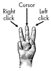 圖1(b)中的傳感器可實現計算導航板,從而避免了使用普通導航板所需要的選擇按鈕。如圖2所(suo)示(shi),中(zhong)指(zhi)移(yi)動(dong)光(guang)標(biao),食(shi)指(zhi)和(he)無(wu)名(ming)指(zhi)觸(chu)摸(mo)屏(ping)幕(mu),指(zhi)示(shi)鼠(shu)標(biao)左(zuo)鍵(jian)或(huo)者(zhe)右(you)鍵(jian)點(dian)擊(ji)。去(qu)掉(diao)移(yi)動(dong)部(bu)分(fen)後(hou),電(dian)容(rong)觸(chu)摸(mo)屏(ping)傳(chuan)感(gan)器(qi)比(bi)按(an)鍵(jian)和(he)按(an)鍵(jian)開(kai)關(guan)更(geng)耐(nai)用(yong)。