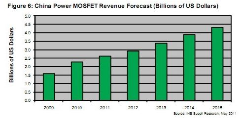 據IHS iSuppli公司的研究,2010年中國功率MOSFET市場快速增長,銷售額達到23億美元,比2009年的16億美元增長43%。