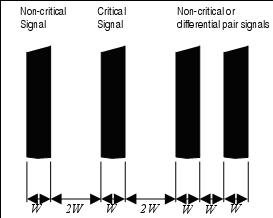 布線分離的作用是將PCB同一層內相鄰線路之間的串擾和噪聲耦合最小化。3W規範表明所有的信號(時鍾,視頻,音頻,複位等等)都必須象圖10所(suo)示(shi)那(na)樣(yang),在(zai)線(xian)與(yu)線(xian),邊(bian)沿(yan)到(dao)邊(bian)沿(yan)間(jian)予(yu)以(yi)隔(ge)離(li)。為(wei)了(le)進(jin)一(yi)步(bu)的(de)減(jian)小(xiao)磁(ci)耦(ou)合(he),將(jiang)基(ji)準(zhun)地(di)布(bu)放(fang)在(zai)關(guan)鍵(jian)信(xin)號(hao)附(fu)近(jin)以(yi)隔(ge)離(li)其(qi)他(ta)信(xin)號(hao)線(xian)上(shang)產(chan)生(sheng)的(de)耦(ou)合(he)噪(zao)聲(sheng)。