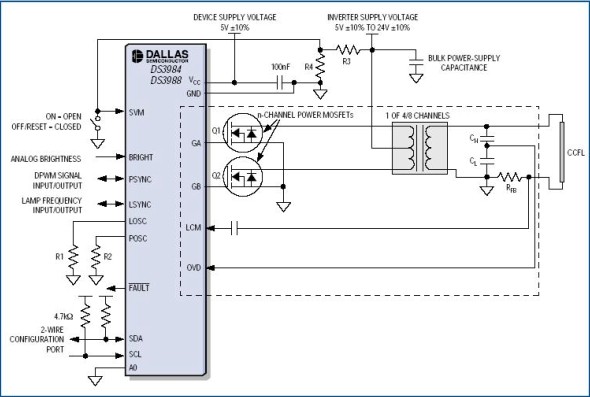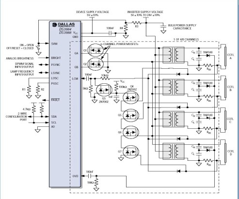 DS3984(四通道)和DS3988(八通道)CCFL控製器解決了本文所提到的所有這些設計挑戰。可將這些元件配置為每個通道驅動一個燈(圖6),或者每通道多個燈(圖7),用戶可靈活裁減設計,以滿足自己的性價比目標。多個DS3984/DS3988可輕鬆串聯,以支援任意數量的燈來為LCD電視螢幕提供背光。