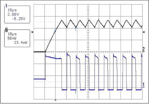 如圖7所示,Q1是降壓型充電器的開關功率晶體管;L1是濾波電感;D1是續流或整流二極管。輸入電容C1為10uF、超低ESR的陶瓷濾波電容。用鉭電容或者其它電解電容替代C1會使充電器的性能降低。R7是電流調節器檢測放大器的檢流電阻。DS2712的基準電壓為0.125V,並具有24mV滯回。通過CSOUT提供閉環、開關模式電流控製。充電控製引腳CC1將Q2的柵極拉低時,使能Q1的柵極驅動。Q1和Q2均為低Vt (柵-源門限電壓)的pMOSFET。CC1和CSOUT均為低電平時,Q2的漏-源電壓將稍大於Vt。該電壓以及CSOUT的正向壓降構成了Q1的柵極開關電壓。CC1為低電平時,啟動電流閉環控製。圖8所示為啟動開關時的波形。上方波形是0.125Ω (檢流電阻兩端的電壓,下方波形是Q1漏極至GND的電壓。開始時,當Q1打開(CC1和CSOUT均為低電平)時,電感電流向上爬升。當電流增大到使檢流電阻兩端的電壓達到0.125V時,CSOUT變為高電平,開關關斷。此後,電感電流開始下降,直到檢流電阻兩端的電壓達到約0.1V,CSOUT又變為低電平。隻要CC1為低電平,該過程將一直持續。