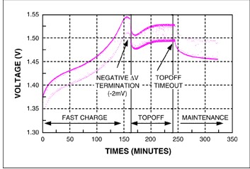 通常采用恒流源對NiMH電(dian)池(chi)充(chong)電(dian)。當(dang)達(da)到(dao)充(chong)滿(man)狀(zhuang)態(tai)時(shi),會(hui)發(fa)生(sheng)放(fang)熱(re)化(hua)學(xue)反(fan)應(ying),並(bing)導(dao)致(zhi)電(dian)池(chi)溫(wen)度(du)上(shang)升(sheng),電(dian)池(chi)端(duan)電(dian)壓(ya)降(jiang)低(di)。可(ke)檢(jian)測(ce)電(dian)池(chi)溫(wen)度(du)上(shang)升(sheng)速(su)率(lv)或(huo)者(zhe)負(fu)向(xiang)電(dian)壓(ya)變(bian)化(hua)率(lv),並(bing)用(yong)來(lai)終(zhong)止(zhi)充(chong)電(dian)。這(zhe)些(xie)充(chong)電(dian)終(zhong)止(zhi)方(fang)法(fa)分(fen)別(bie)稱(cheng)為(wei)dT/dt和-ΔV。充電速率非常低時,dT/dt和-ΔV不太明顯,很難精確檢測到。電池開始進入過充狀態時,dT/dt和-ΔV響應開始顯現。此時如果繼續充電,將損壞電池。
