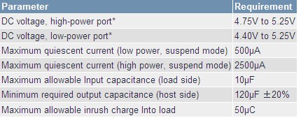 在符合USB 2.0規範的主機中,大功率端口的上遊端具有120uF、低ESR電容。所連接的USB設備的輸入電容限製在10?F以內,在最初的負載連接階段,允許負載從主機(或自供電集線器)吸取的最大電荷數為50?C。這樣一來,當新設備連接至USB端口時,上遊端口的瞬態電壓跌落小於0.5V。如果負載正常工作時需要更大的輸入電容,則必須提供浪湧電流限製器,以保證對更大的電容充電時電流不會超過100mA。