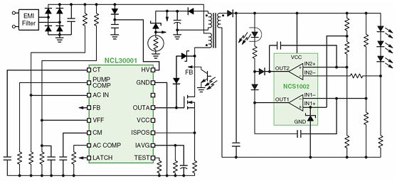 圖6 基於NCL30001 LED驅動器和NCS1002控製器的90 W LED驅動器演示板電路
