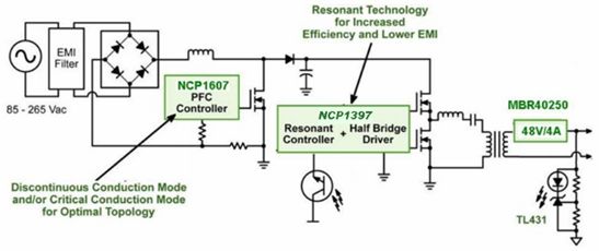 LLC拓tuo撲pu結jie構gou采cai用yong串chuan聯lian類lei型xing的de諧xie振zhen轉zhuan換huan器qi,能neng在zai相xiang對dui寬kuan的de輸shu入ru電dian壓ya和he輸shu出chu負fu載zai範fan圍wei下xia工gong作zuo。此ci外wai,由you於yu諧xie振zhen儲chu能neng元yuan件jian可ke以yi部bu分fen或huo完wan全quan集ji成cheng在zai主zhu變bian壓ya器qi中zhong,LLC拓撲結構隻需要數量有限的元器件。再加上在所有負載條件下,LLC拓撲結構的初級開關都能工作在零電壓開關條件,次級整流器都能工作在零電流開關條件。所以,LLC拓撲結構是高性價比、高能效及優化了電磁幹擾的解決方案。