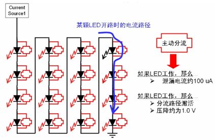 區域照明應用中通常會采用多串LED,雖然LED本身可靠性高,但若LED串中的某個LED開路,那麼整串LED就可能關閉,而街道照明等應用中必須避免這種狀況,從而降低後期維護成本。為了增強LED串的可靠性,這種安森美半導體推出了NUD4700 LED電流旁路保護器。NUD4700器件是一款分流器件,當LED串中某個LED開路時,就會提供電流旁路,確保整串LED不會關閉;而且恰當處理散熱的話,還可支持大於1 A的大電流,其工作原理如圖8所示。