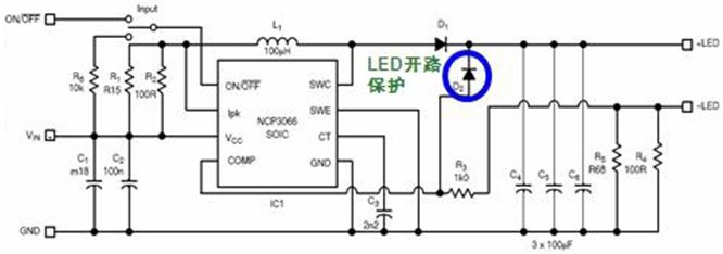 典型3 W-20 W DC-DC LED升壓應用常見於DC-DC LED驅動器。這類應用的輸入電壓為5至28 Vdc,支持350 mA或700 mA恒流輸出,能效不低於90%。這類應用可以采用NCP3065/NCP3066 LED驅動器。NCP3065/NCP3066能夠配置為降壓、升壓、單端初級電感轉換器(SEPIC)和逆變器等不同模式,並提供相應的汽車應用版本,即NCV3065/NCV3066。圖4顯示的是NCP3066的升壓配置LED應用電路圖。