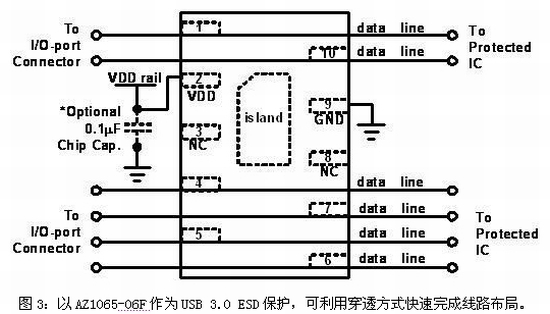 AZ1065係列產品提供了六個極低電容的引腳,可同時保護USB 3.0的兩組差動對(TX和RX)及USB 2.0的差動對(D+和D-),具有減小PCB麵積和降低布局複雜度等優點,並可大幅節省係統成本。更特別的是,AZ1065-06F率先采用交錯型的引腳,以便PCB布局時可利用穿透式(Feedthrough)方式實現完美設計,圖3顯示了AZ1065-06F的接線方式。