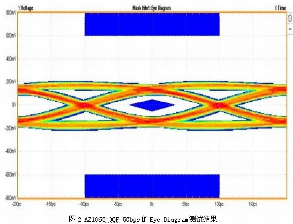 在IEC 61000-4-2接觸模式6kV(TLP電流等效約為17A)的ESD攻擊下,箝製電壓僅有13.4V,足以有效避免係統產品在靜電測試時發生數據錯誤、當機甚至損壞的情況。圖2所示為裝有ESD保護組件AZ1065-06F的USB 3.0端口順利通過5Gbps的眼圖測試結果。