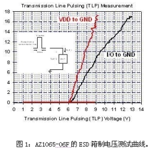 最重要是,與相同的寄生電容相比,AZ1065擁有最低的ESD箝製電壓,可有效防止數據傳輸時被ESD事件幹擾,這樣才能讓具有USB 3.0連接端口的電子係統得以通過Class-A的IEC 61000-4-2係統級靜電放電保護測試。利用傳輸線脈衝係統(TLP)測量AZ1065-06F後,可以觀察到如圖1所示的ESD箝製電壓特性。