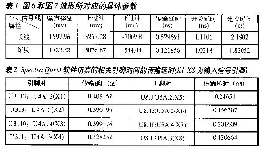 檢jian測ce器qi的de每mei個ge信xin號hao應ying盡jin可ke能neng保bao持chi同tong一yi傳chuan輸shu延yan遲chi,這zhe就jiu要yao求qiu布bu線xian時shi盡jin量liang保bao持chi長chang度du一yi致zhi,對dui於yu微wei弱ruo的de差cha別bie,可ke以yi根gen據ju仿fang真zhen結jie果guo延yan長chang或huo縮suo短duan布bu線xian。完wan成cheng布bu線xian以yi後hou,再zai利li用yongSpectra Quest軟件仿真輸入信號的傳輸延遲,具體參數如表2所示。可以看出,其相對延時不超過0.2ns,仿真結果比較理想。