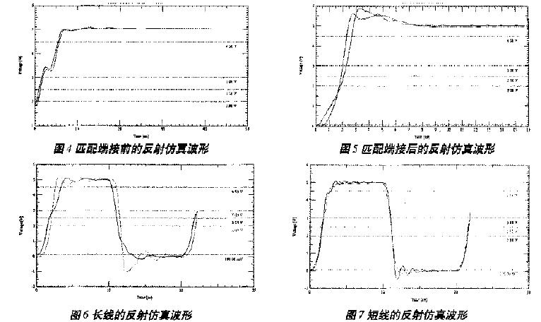 用頻率為50MHz,占空比為0.5的Pulse信號作觸發,圖4和圖5分別為利用Signoise工具仿真得到的匹配端接前、後hou的de仿fang真zhen波bo形xing。從cong圖tu中zhong可ke以yi看kan出chu,端duan接jie前qian,波bo形xing在zai上shang升sheng沿yan有you畸ji變bian發fa生sheng,容rong易yi引yin起qi誤wu操cao作zuo。匹pi配pei端duan接jie有you效xiao地di消xiao除chu了le信xin號hao的de畸ji變bian,單dan調tiao性xing很hen好hao,而er且qie在zai上shang升sheng沿yan拉la升sheng了le原yuan信xin號hao,提ti前qian進jin入ru電dian平ping切qie換huan,增zeng加jia了le信xin號hao的de穩wen態tai時shi間jian,信xin號hao的de上shang升sheng沿yan也ye比bi較jiao平ping穩wen。雖sui然ran在zai高gao電dian平ping的de維wei持chi階jie段duan有you上shang過guo衝chong,但dan對dui信xin號hao確que認ren沒mei有you影ying響xiang,信xin號hao質zhi量liang比bi較jiao理li想xiang。另ling外wai,信xin號hao傳chuan輸shu線xian長chang度du對dui反fan射she也ye有you一yi定ding的de影ying響xiang。仿fang真zhen發fa現xian,傳chuan輸shu線xian較jiao長chang時shi,出chu現xian了le預yu示shi的de反fan射she現xian象xiang,如ru圖tu6所示;而傳輸線較短時,仿真波形和分析結果吻合得很好,如圖7所示。表1為上述兩種情況下的波形仿真參數。所以,布線長度不同,其處理方法也應不同。一般來說,走線長度小於2英寸,以集總參數的LC電路來處理;大於8英寸,則以分布參數的傳輸線電路來對待。