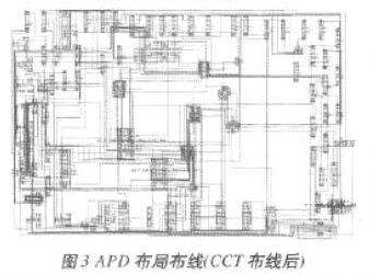 如上所述,MCM布局布線的實現包括電路原理圖生成、擴充零件庫及最終的布局布線完成和加工數據文件輸出。APD Layout包括Padstack(*.pad)、Package Symbol(*.psm)、Mechanical Symbol(*.bsm)、Format Symbol (*.osm)和Shape Symbol(*.ssm)五種,MCM布局布線設計中,所有的布局都必須有正確的Library Packing。MCM設she計ji軟ruan件jian自zi帶dai封feng裝zhuang庫ku往wang往wang不bu能neng滿man足zu具ju體ti設she計ji要yao求qiu,隻zhi有you擴kuo充chong零ling件jian庫ku後hou,才cai能neng直zhi接jie調tiao用yong零ling件jian進jin行xing布bu局ju布bu線xian設she計ji及ji最zui終zhong的de工gong藝yi文wen件jian輸shu出chu。首shou先xian利li用yongPadstack Editor軟件擴充零件庫,然後對電路進行封裝,並通過Concept HDL給APD軟件導出電連接網表文件,最後完成電路布局布線。以檢測器電路為例,其原理圖主要部分如圖2所示,圖3為CCT(Spectra)布線後的形式。整個設計中,定義了16個Padstack和81個封裝符號,進行251次調用Padstack和89次調用功能單元,其中共用到了251個元件封裝符號引腳和229個功能單元引腳。
