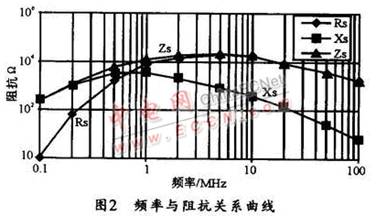 EMI 濾波器需要抑製的頻率範圍通常在10kHz~50 MHz之間。為了使共模濾波電路在此頻率範圍內都能提供適當的衰減,磁芯在此頻率範圍內的阻抗必須都要很高。共模磁芯的總阻抗(Zs)由串聯感性阻抗 (Xs)和串聯阻性阻抗(Rs)兩部分組成。在低頻部分,磁芯阻抗主要以感性阻抗為主,隨著頻率的增加,阻性阻抗逐步增加,漸漸起主要作用,圖2所示是頻率與阻抗的關係曲線。圖中,兩種阻抗的結合,可使磁芯在此全頻範圍內提供合適的總阻抗(Zs)。