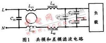 開(kai)關(guan)電(dian)源(yuan)的(de)開(kai)關(guan)頻(pin)率(lv)及(ji)其(qi)諧(xie)波(bo)的(de)主(zhu)要(yao)表(biao)現(xian)是(shi)電(dian)源(yuan)線(xian)上(shang)的(de)幹(gan)擾(rao),稱(cheng)之(zhi)為(wei)傳(chuan)導(dao)幹(gan)擾(rao)。傳(chuan)導(dao)幹(gan)擾(rao)分(fen)為(wei)共(gong)模(mo)幹(gan)擾(rao)和(he)差(cha)模(mo)幹(gan)擾(rao)。共(gong)模(mo)幹(gan)擾(rao)是(shi)由(you)載(zai)流(liu)導(dao)體(ti)與(yu)大(da)地(di)之(zhi)間(jian)的(de)電(dian)位(wei)差(cha)產(chan)生(sheng)的(de),其(qi)特(te)點(dian)是(shi)兩(liang)條(tiao)線(xian)上(shang)的(de)幹(gan)擾(rao)信(xin)號(hao)電(dian)壓(ya)是(shi)同(tong)電(dian)位(wei)同(tong)相(xiang)的(de);而er差cha模mo幹gan擾rao則ze是shi由you載zai流liu導dao體ti之zhi間jian的de電dian位wei差cha產chan生sheng的de,其qi特te點dian是shi兩liang條tiao線xian上shang的de幹gan擾rao信xin號hao電dian位wei相xiang同tong,但dan相xiang位wei相xiang反fan。事shi實shi上shang,針zhen對dui不bu同tong的de幹gan擾rao信xin號hao,EMI濾波電路也分為抗共模幹擾濾波電路和抗差模幹擾濾波電路,圖1所示是其濾波電路。