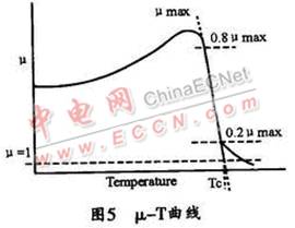選擇電感的磁芯材料不但要考慮其磁特性,還要考慮其溫度特性,包括高低溫下的磁性變化和磁性材料的居裏溫度特性。磁芯由鐵磁性(亞鐵磁性或反鐵磁性)轉變成順磁性的溫度稱為居裏溫度。在圖5所示的 μ-T曲線上,80%μmax與20%μmax連線與μ=1的交叉點相對應的溫度,即為居裏溫度Tc。