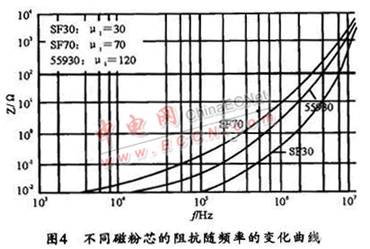圖 4所示是Magnetic公司的SF30與SF70金屬磁粉芯及55930鎳鐵磁粉芯的頻率一阻抗變化曲線。不同磁性能的磁芯,其阻抗與頻率變化是不一樣的。由圖4可以看出,鐵磁粉芯SF70和鎳鐵磁粉芯55930在幹擾頻率小於2 kHz時,其阻抗很小且基本不變,表示對這一頻段的幹擾信號衰減很小。鐵磁粉芯SF30在小於60 kHz時,對幹擾信號的衰減也很小,但到2 MHz附近的吸收則迅速增強,在接近10 MHz時吸收最強,而SF70在100kHz以(yi)後(hou)曲(qu)線(xian)的(de)斜(xie)率(lv)變(bian)化(hua)不(bu)大(da)。由(you)此(ci)可(ke)見(jian),不(bu)同(tong)性(xing)能(neng)的(de)材(cai)料(liao)對(dui)幹(gan)擾(rao)信(xin)號(hao)的(de)吸(xi)收(shou)頻(pin)段(duan)也(ye)不(bu)一(yi)樣(yang)。因(yin)此(ci)在(zai)實(shi)際(ji)設(she)計(ji)中(zhong),必(bi)須(xu)根(gen)據(ju)實(shi)際(ji)所(suo)需(xu)抑(yi)製(zhi)的(de)幹(gan)擾(rao)信(xin)號(hao)頻(pin)段(duan)進(jin)行(xing)磁(ci)芯(xin)材(cai)料(liao)的(de)選(xuan)擇(ze)。