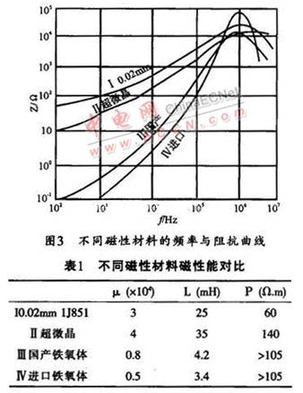 共模電感線圈如圖l中Lcl,Lc2是繞在一隻磁芯上的兩組獨立的線圈,所繞圈數相同,繞向相反。這樣,當EMI濾lv波bo器qi接jie入ru電dian路lu後hou,兩liang組zu線xian圈quan產chan生sheng的de磁ci通tong在zai磁ci芯xin中zhong將jiang相xiang互hu抵di消xiao,故gu不bu會hui使shi磁ci芯xin飽bao和he。對dui於yu幹gan擾rao信xin號hao而er言yan,共gong模mo磁ci芯xin一yi般ban工gong作zuo在zai低di磁ci場chang區qu域yu,所suo以yi,共gong模mo濾lv波bo電dian感gan選xuan用yong的de磁ci性xing材cai料liao要yao求qiu具ju有you較jiao高gao的de初chu始shi磁ci導dao率lvμi。如果隻針對濾波器的插入損耗這一指標,則初始磁導率μi越yue高gao,濾lv波bo電dian路lu呈cheng現xian的de感gan抗kang就jiu越yue大da,所suo得de到dao的de插cha入ru損sun耗hao指zhi標biao就jiu越yue好hao。但dan在zai整zheng個ge電dian路lu中zhong,還hai要yao綜zong合he考kao慮lv磁ci性xing材cai料liao在zai電dian路lu中zhong的de其qi它ta特te性xing,如ru頻pin率lv阻zu抗kang特te性xing、居裏溫度、磁材的形狀等等。μi值不同的各種磁性材料,在不同頻率下的阻抗特性也不一樣,故要根據所需要的頻率範圍來選取合適μi值的磁性材料。圖3所示是不同類型的高μi軟磁材料在同樣條件下的頻率與阻抗關係曲線,該曲線反映出電感磁芯的插入損耗變化趨勢。其它的性能參數(如電感值、體電阻等)如表1所列。
