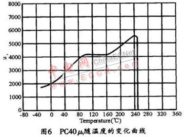 中小功率的EMI濾波器產品中選用最多的磁芯材料是日本TDK公司 的PC40 (它是目前業界廣泛使用的較好的材料之一),它的初始磁導μi隨溫度的變化曲線如圖6所示。從圖中可看出,溫度變化對μi的影響是很大的,磁芯溫度在 90~150℃的區間內,有一段平坦區,這時它的μi大約在4100左右;當溫度低於90℃後,μi值會隨著溫度的降低而逐漸減小,到0℃時,μi值隻有 2000左右,進到負溫區後,μi值還會進一步減小;而當溫度高於150℃後,μi值則會隨著溫度的升高而增加,當達到240℃時,μ的最大值為5600 左右;從240℃開始,μi值又漸漸減小,當溫度達到居裏溫度點250℃時,材料失去磁性。