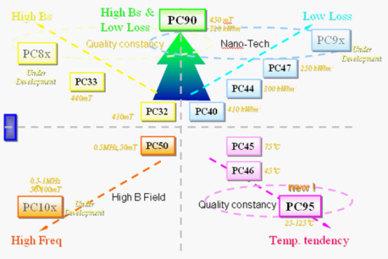 下麵對高性能的材料做一個簡單介紹。LED變壓器的係統需要高飽和磁通密度和低損耗的特點,TDK開發了一個PC47係xi列lie的de變bian壓ya器qi材cai料liao,它ta的de發fa展zhan方fang向xiang就jiu是shi下xia圖tu箭jian頭tou所suo指zhi的de方fang向xiang,縱zong軸zhou是shi飽bao和he度du磁ci通tong密mi度du和he低di損sun耗hao。這zhe邊bian是shi我wo們men對dui比bi市shi麵mian一yi些xie通tong用yong的de磁ci芯xin變bian壓ya器qi,和heTDKxianzaisuoyanfahebuduangengxinchanpintexingdebijiao。congyouxiajiao,fenhongsededianshimuqianshichangshangchangyongdeyixiecailiaodexingneng,hengzuobiaoshicitongliang,zongzuobiaoshibaohedemidu。womenkeyifaxiancongxianzaishichangshangzhexiefenhongsededianshizai500Core Loss,磁通密度在380,跟TDK PC40材料是相當的。PC47材已經有很大的改善,在420的磁通密度,在250左右的Core Loss,也就是說相比通常所用的係列有比較大的改善。