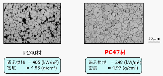 至於高性能材質的研發,設計的原理,材質研發出來,它的密度更大。拿PC40材和PC47材兩個材質高倍放大鏡成像的對比,可以發現左邊PC40材質有很多黑色的點。那些點是間隙,粒子之間存在很多間隙。右邊PC47材質黑點比PC40材小,也就是說PC47材密度會遠遠大於PC40材質,從而降低磁芯損耗,提高變換效率,降低發熱。基於材料開發及燒製因素(燒製方法、溫度條件)的最適度,實現材料的高密度設計。