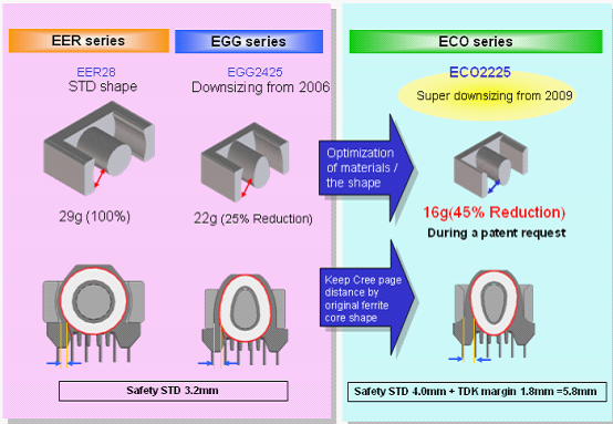 活用高性能材質的優點,以EER28市麵上最常用的一種變壓器型號分析。由於密度更大,我們可以使變壓器更輕、更小。比如在同樣功率的情況下,用高性能材質體積和重量會比普通材質更小。這邊僅以EER28為例,我們將以ECO2225係列可以取代市場上的EER28,重量有45%的消減。