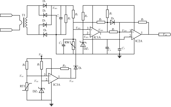 借助上述電路我們可以很容易地構成,輸入過、欠壓保護,輸出過、欠壓保護,以及過熱保護。在此僅以附加過熱保護為例,說明如下:如圖1所示,過熱保護線路是由IC3A及其周邊元件組成。當電源的溫度沒有超過設定溫度時,Vot1<Vot2,運放IC3A的輸出電壓Vot3為低電平,由於有二極管D6的存在,此時IC3A的輸出電壓Vot3不會影響到VOP2的電壓,也就是說在過熱保護線路未起作用時,它不會影響到上述的過流保護線路的性能。當電源的溫度超溫時Vot1>Vot2,運放IC3A的輸出電壓Vot3變為高電平,通過二極管D6,使VOP2的(de)電(dian)壓(ya)升(sheng)高(gao),從(cong)而(er)觸(chu)發(fa)過(guo)流(liu)保(bao)護(hu)線(xian)路(lu)使(shi)電(dian)源(yuan)進(jin)入(ru)停(ting)止(zhi)工(gong)作(zuo)期(qi)。隻(zhi)有(you)當(dang)電(dian)源(yuan)溫(wen)度(du)降(jiang)低(di)到(dao)超(chao)溫(wen)保(bao)護(hu)點(dian)以(yi)下(xia)時(shi),電(dian)源(yuan)才(cai)能(neng)重(zhong)新(xin)進(jin)入(ru)正(zheng)常(chang)工(gong)作(zuo)狀(zhuang)態(tai)。依(yi)此(ci)類(lei)推(tui)可(ke)以(yi)構(gou)成(cheng)其(qi)它(ta)輸(shu)入(ru)輸(shu)出(chu)過(guo)、欠壓保護線路。在此不再贅述。