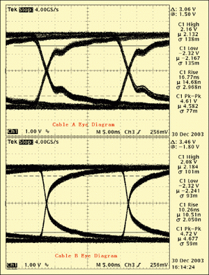圖4是實際應用的眼圖情況,很明顯電纜B的眼圖要比電纜A的眼圖要好,和前麵的仿真結果比較吻合,不過電纜A的實際反射比較大一點,這和仿真使用驅動器件的模型有關。