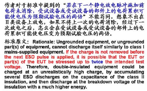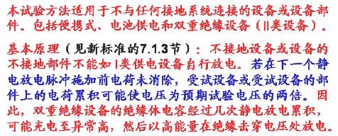 關於不接地設備的試驗配置,新版標準與舊版標準的配置是相同的。關鍵是在單次放電時(無論是空氣的,還是接觸的),試品上的電荷應當在每次施加靜電放電脈衝之前先行釋放(釋放掉在需要施加靜電放電的金屬點或金屬部位上的電荷)。