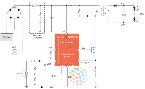 消費者用LED節能燈取代白熾燈等傳統照明解決方案的同時,也希望得到同樣或更好的照明體驗。不幸的是,他們常常發現LED燈在調光能力上有問題,因此覺得LED燈幾乎不能調光或調光時會閃爍。很多LED燈與家中已安裝的壁式調光器也不兼容。Marvell最新的88EM8183深度調光單級交流/直流 LED驅動器IC為OEM廠商和ODM廠商提供了兼容性最廣泛的調光解決方案,該IC與全球市場上絕大多數調光器都兼容,而且提供卓越的光輸出質量,可提高消費者的滿意度,減少退貨。