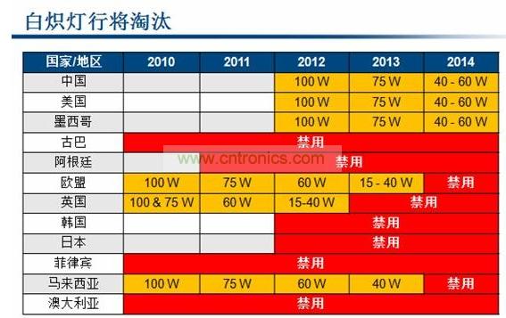 Power Integrations產品營銷經理Andrew Smith道:“所有的國家都是先從大功率的100W白熾燈開始淘汰,接下來才是75W等小功率的白熾燈。歐盟在2010年就淘汰了100W白熾燈,美國、中國等則是在2012年開始淘汰。所以市場上對於能替換100W白熾燈的大功率LED是有非常強勁的市場需求的。”