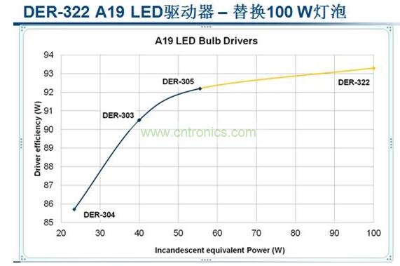 現在100 W白熾燈替換LED一般都需要采用PAR38,采用A19規格的LED尚未出現。現在PI已經推出業界首個針對100 W A19白熾燈泡替換應用的LED驅動器設計DER-322,該驅動器可為100 W A19白熾燈泡的LED替換燈提供所需的功率,這是業界首個此類設計。PI大功率LED驅動設計的推出,對於替換100W白熾燈大功率LED快速進入市場有很大的推動的作用。