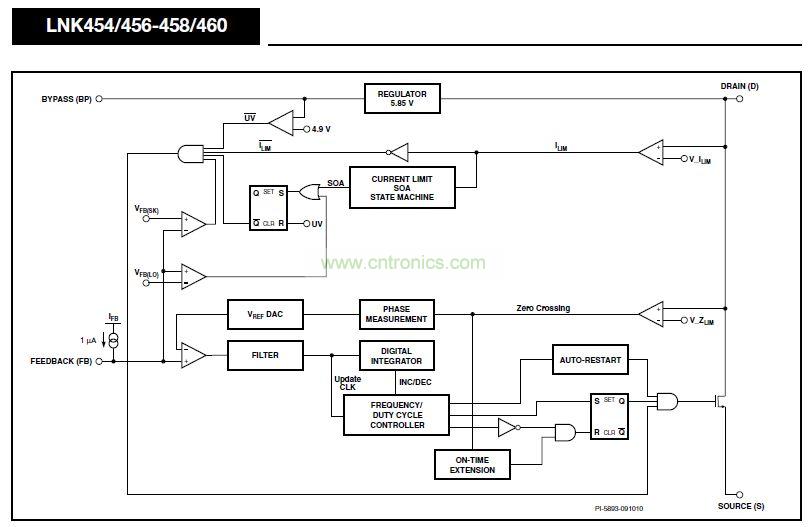 LinkSwitch-PL在一個器件上集成了一個高壓功率MOSFET開關及一個電源控製器。該IC器件提供單級功率因數校正和LED電流控製。LinkSwitch-PL控製器包括一個振蕩器、反饋(檢測及邏輯)電路、5.85 V穩壓器、遲滯過熱保護、頻率抖動、逐周期限流、環路補償電路、自動重啟動、開關導通時間延長、功率因數以及恒流控製電路。